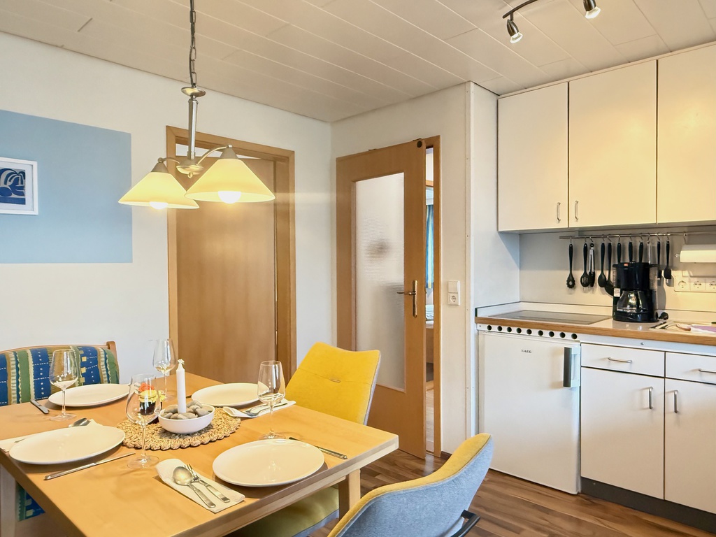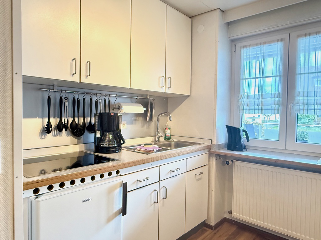 In der Küche bzw. dem Wohnraum der Ferienwohnung "Rebgarten" befindet sich eine Einbauküche mit einem 4-Platten- Ceranfeld. Kühlschrank, Kochutensilien, Filter-Kaffeemaschine, Wasserkocher, Toaster, Eierkocher , Salatschleuder, Handrührgerät etc laden zum Kochen ein.