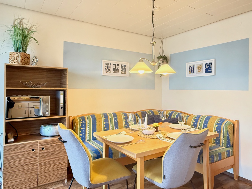 Die gemütliche Sitzecke mit Blick auf den großen Balkon lädt zum Faulenzen und TV schauen sowie zum Essen ein.